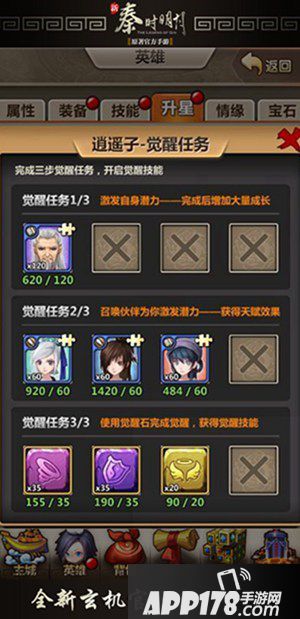 要觉醒逍遥子首先要完成三个觉醒任务,任务完成后即可开启觉醒技能。