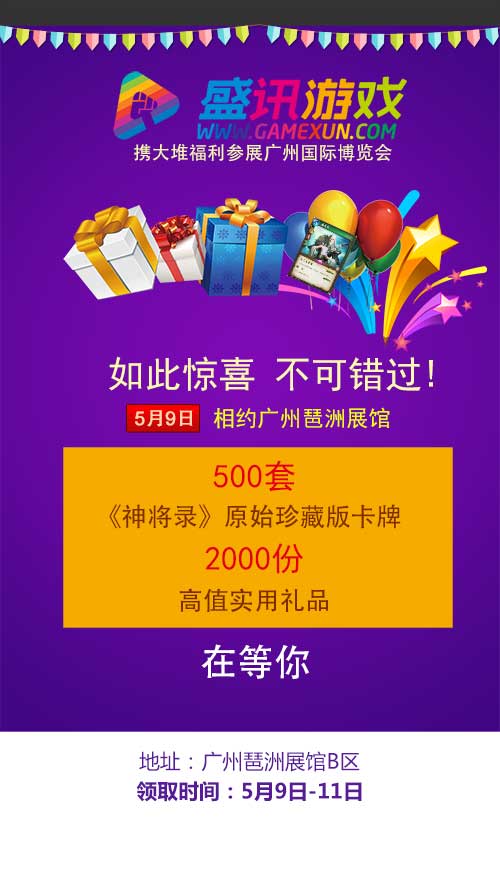 除隆重推介这三款高品质游戏大作外,在展会现场,盛讯游戏为玩家准备大量免费福利,以及多种现场活动,与玩家互动。玩家现场试玩游戏可免费抽奖,获得超值实用礼物。挑战冠军选手,获胜则可获得含Ipad mini 3在内的价值3千多元的打擂惊喜大礼包。礼品多多,惊喜不断,500套《神将录》原始珍藏版卡牌,2000多份超值实用礼品,等你拿!