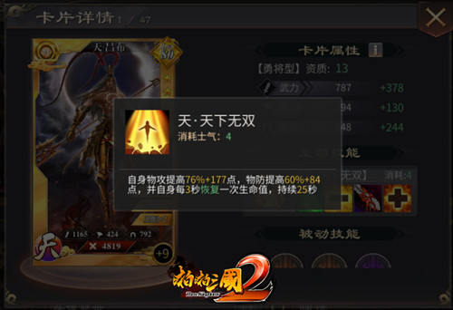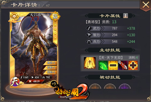温侯吕布在《啪啪三国2》中是一名勇将,超高的武力值完美体现了吕布第一战神的威名。其独有技能“天下无双”,可提升自身不小的物攻与物防,并恢复自身生命力。吕布拥有强悍的物理输出,让对方没有招架之力,在局势瞬息万变的战场上抢占先机!