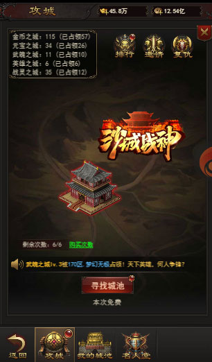 在跨服城战中,玩家可寻找城池,召唤英雄为你攻城略地,英雄分为SR与SSR,激活英雄即可获得对应技能,提升英雄星级可以提升相应技能等级,英雄可进行升星与升级,在战斗胜利后会成为守城英雄。
