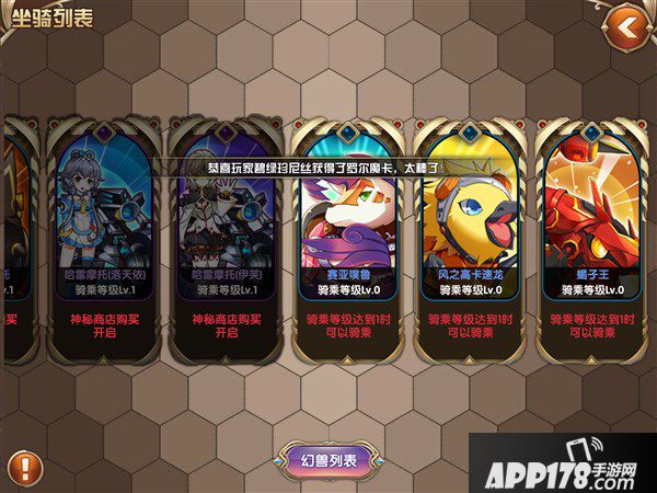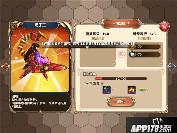 玩家可以在幻兽界面的坐骑骑乘选项中使用驯化草提升幻兽的驯化进度,当驯化进度达到满值后便可以提升骑乘等级,当骑乘等级大于1级时幻兽便可骑乘!