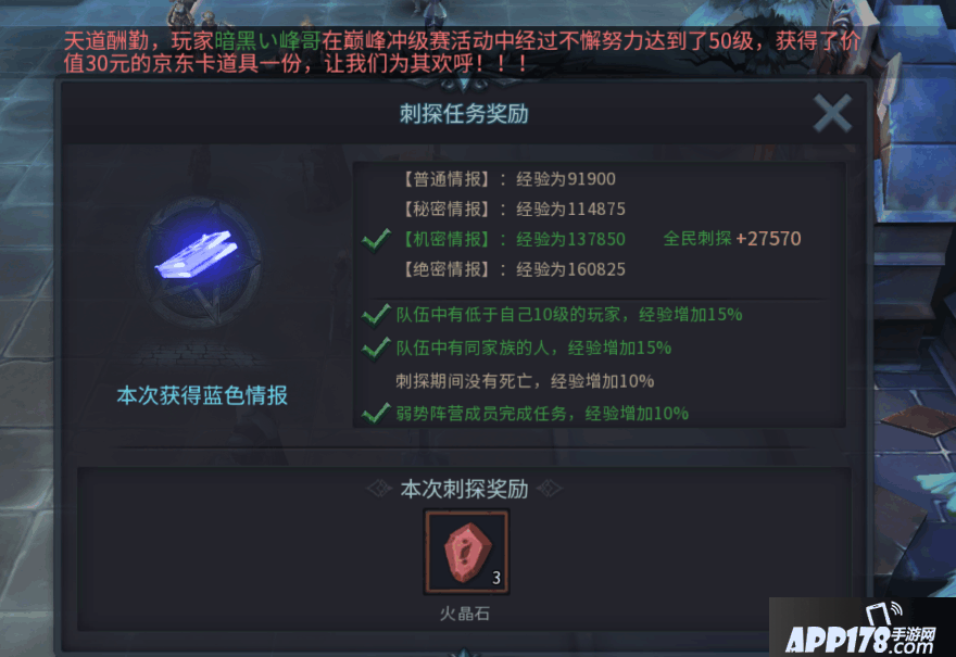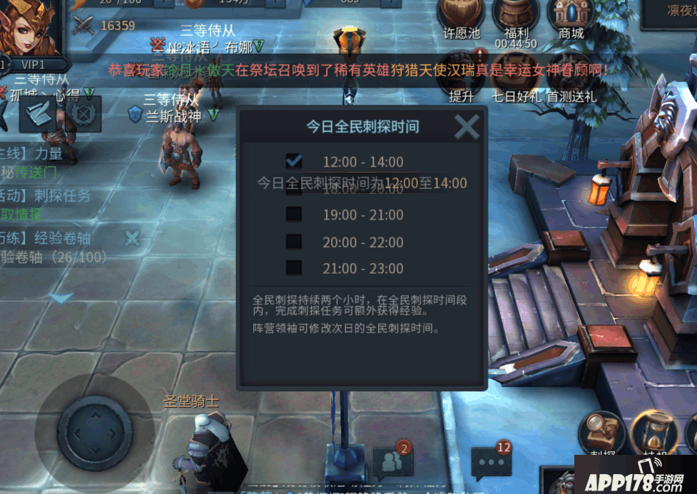 首先刺探任务的经验是浮动的,默认的额外奖励时间是中午12:00~14:00点,也可以有个阵营领袖来修改。
