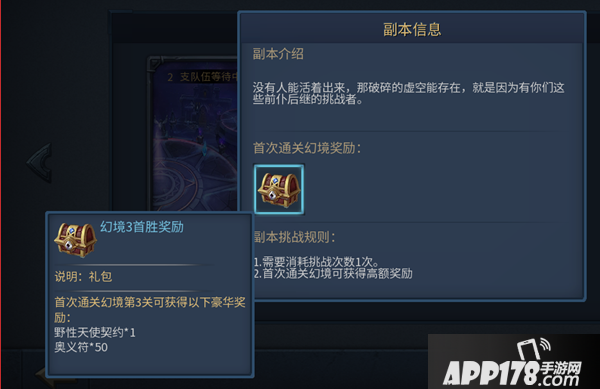 首次通关幻境将会获得相应的幻境礼包奖励,同时解锁下一关幻境。随着幻境关卡的递增通关难度也会加大,相应的奖励也是非常诱人的,首次通过幻境第三关即可获得橙色佣兵野性天使整只,不难想象以后的关卡奖励必然是极为豪华的。