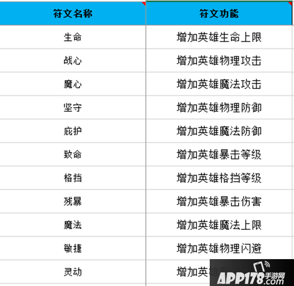 英雄符文共分为11种,详细名称及功能见下图: