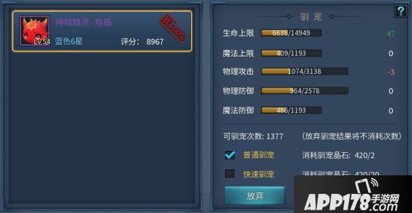 如上图,生命上限+47所占上限14949的比例为0.0031;而物理攻击-3所占上限3138的比例为0.0009。0.0031>0.0009所以此次驯宠可以保留。