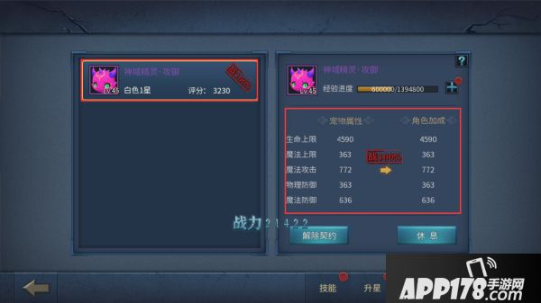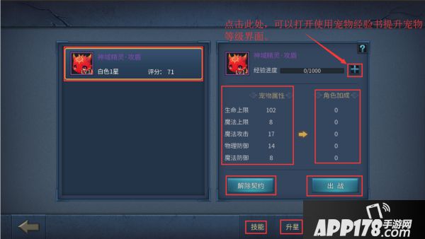 获取宠物后,在宠物界面中可以看到五个标签页,分别是技能、升星、驯宠、宠物和列表。其中在宠物界面,玩家可以完成对宠物的最基本操作,包括使用经验书升级、出战操作、解除契约操作。并可以查看到宠物的属性以及出战后给角色的加成属性。