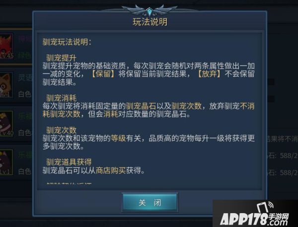 驯宠提升宠物的基础资质,每次驯宠会随机对两条属性做出一加一减的变化,【保留】将保留当前驯宠结果,【放弃】不会保留驯宠结果。需要特别说明的是解除契约将返还保留驯宠所消耗的驯宠晶石,放弃驯宠消耗的晶石将不返还。详细玩法说明见下图:
