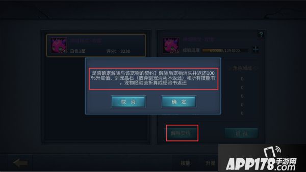 在宠物界面中,玩家还可以对宠物进行解除契约操作,解除契约可分解已拥有的宠物并返还培养材料,100%返还升星值;宠物经验将以宠物经验书的形式返还;放弃驯宠消耗的驯宠晶石不返还;宠物技能书将会自动摘除保留技能书等级,技能书经验将会损失。