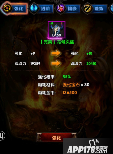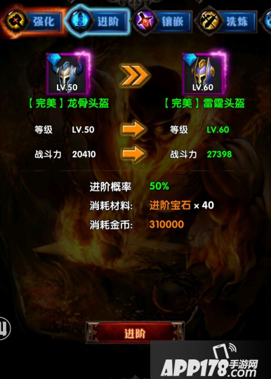上述截图显示完美龙骨头盔50等级,强化已经满级,经过进阶可以变成完美雷霆头盔,等级变为60级,战力也有大幅提升。注意,进阶的前提条件是装备已经达到强化+10等级。