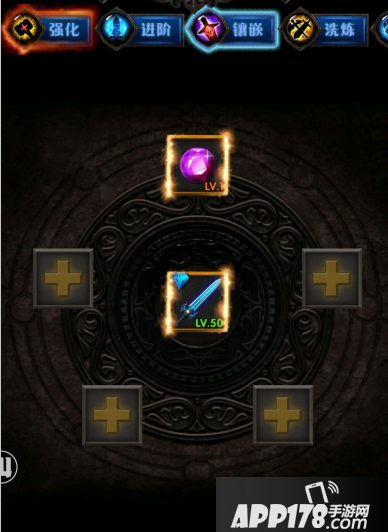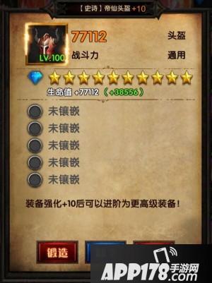 点击打开上面帝仙头盔,显示有5个槽位可以镶嵌宝石,点击镶嵌功能就可以选择每个槽位嵌入何种类型宝石,宝石有多种类型,包括有加强攻击,加强护甲,增加命中,吸血,麻痹等等,都会提升你的战斗力。