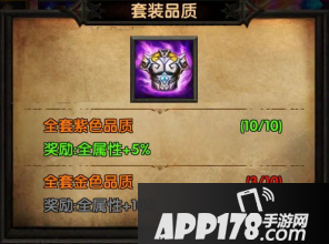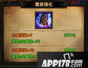 除了上述单件装备的强化功能外,还有套装的强化功能,分为两类,一类是全部套装的品质达到紫色或者金色时,有额外的全属性+5%和10%的奖励,另一类是全套装备强化都+7时额外奖励全属性+5%,全套装备强化都+10时额外奖励全属性+10%。全属性增加这会极大提升战斗力,属于必定追求的指标。