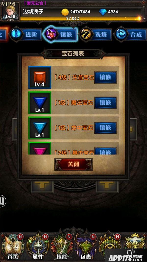 首先大家可以看到在日常的战斗中,玩家会收获一些宝石,这些宝石可以镶嵌到不同的装备上,我们以武器为例,大家可以看到武器上有5个槽位,目前已经镶嵌了一颗宝石,还可以镶嵌5颗,点击空槽位就会弹出宝石列表,这个时候就要根据玩家的策略进行不同的选择了,例如走暴力流就加暴击宝石,走猥琐流就加吸血宝石等等。