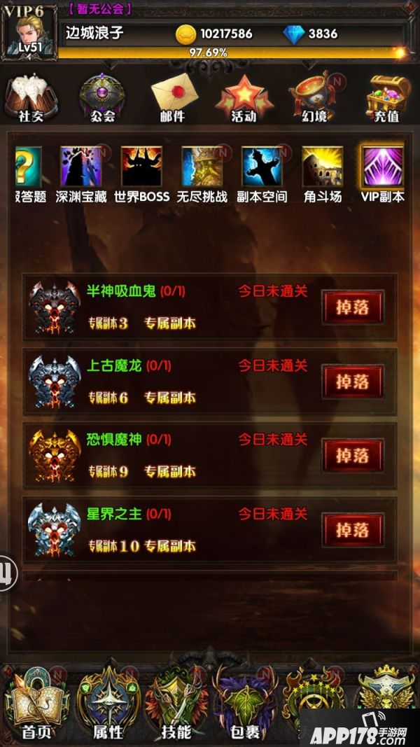 在暗黑世界里,高等级VIP玩家还是有一些特权待遇的哟,如下图所示,不同VIP等级玩家可以开启不同等级的副本,相应的不同等级副本的BOSS以及掉落也是不同的,小编就有幸和上古魔龙PK了一把,至于掉落的宝贝嘛,在这里卖个关子,各位玩家赶紧自己去战斗吧,获取稀世珍宝,神兵利器,成就一代王者!