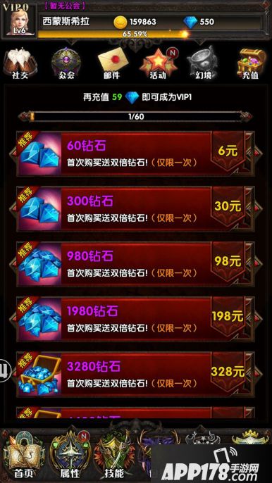 首充双倍:如下图所示,商城内所有档位首次充值都可以享受双倍钻石奖励,等于打5折!