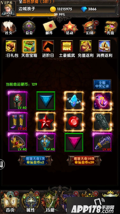 这个命运金币可以在天命宝箱内抽奖中,小编尝试抽了一次,倒吸一口凉气,居然抽中6个紫装,两个宝石,一个7倍经验符以及一个洗练水晶,逆天的奖励。