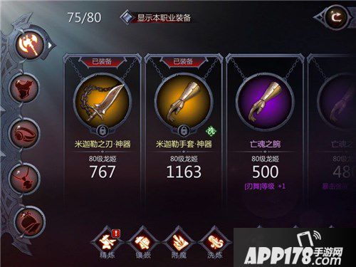 (在游戏的创新中,装备展示选择横版滑屏式浏览,大家清楚看到装备的等级、评分、额外属性,可以直接审阅装备,打破了点击查看基本属性的传统模式。)