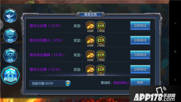 任务按照绿色,蓝色,紫色,橙色(奖励最多)。可以使用暗夜宝珠刷新任务。