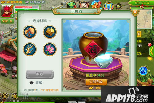 开始酿酒后,我们可以发现当天的可酿酒次数从3变成2了。同时,会出现一个酿造完成的倒计时,整个酿酒的时间是5分钟,所有品质都一样。如果有等不及倒计时结束的玩家,可以点击“立即完成”按钮跳过这个等待时间。