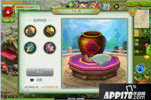 酿酒时先在窗口左侧选择酿酒的材料,材料放的越多,酿出来的酒的品质越高,喝酒时获得的经验越高,当然,越是高品质的酒,酿造的费用也越高。材料选择好了以后,点左下角的“酿酒”按钮,就开始酿造了。