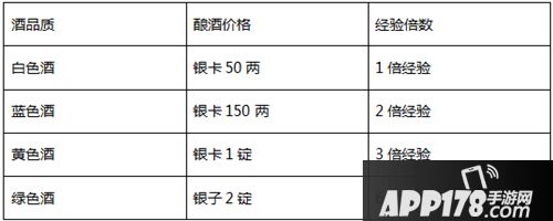 不同品质的酿造价格和获取的经验倍数如下: