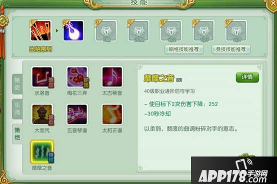 在20级进阶到乐师后,太古遗音、诗经和太古正音技能能永久提升伤害、生命值和防御力。平沙落雁和幽壑潜蛟为单体暴击攻击技能并且能够提升暴击。余音绕梁为减伤护盾技能。