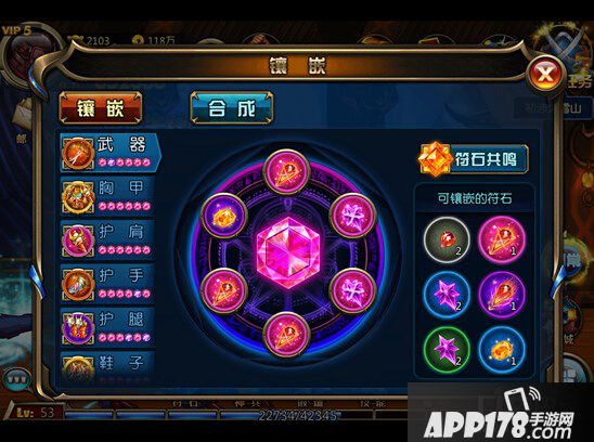 符石玩法:符石是英雄的宝物之一,每个符石提升的战斗属性对应不同,也可通过合成符石提升等级。