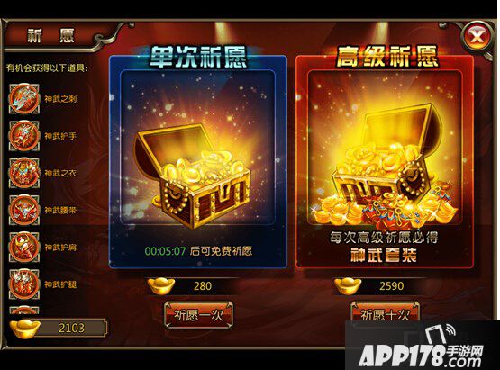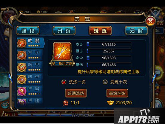 装备玩法:装备收集(祈愿),强化(100%强化成功率且继承);升阶;洗练(继承)。