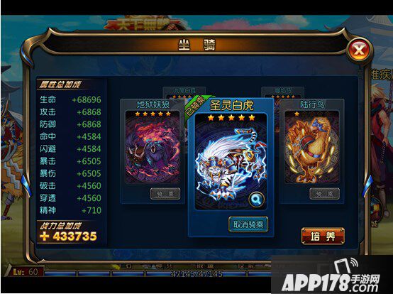坐骑玩法:坐骑获取、坐骑培养、坐骑进阶,不同坐骑可提升的战斗属性加成不同。