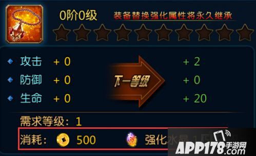 从下图可以看到0阶升阶到1阶需要金币+1个强化石,1阶到2阶消耗金币若干+2个强化石,2阶到3阶需要金币+3个强化石,以此类推。