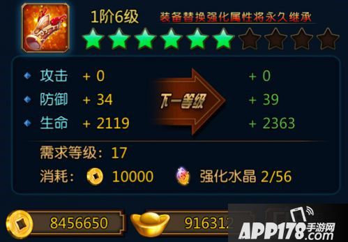 当然每个部位的装备强化分不同的级别:0阶、1阶、2阶、3阶、4阶、5阶..而每阶又分为10个级(星级),也就是说0阶到1阶需要强化10级(10个星级)才能到1阶。