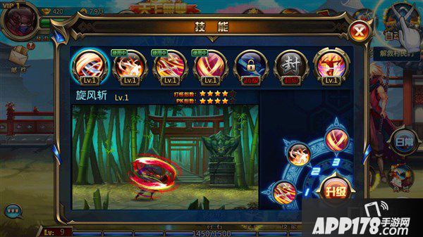 旋风斩:前方小范围内快速连续攻击,将敌人打浮空并造成倒地效果;打怪指数4颗星,PK指数4颗星;冷却时间4秒,攻击次数8次,造成精神消耗15MP。