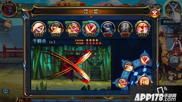 千瞬杀:瞬步移动到敌人面前,上下飞舞飞速地对敌人进行全屏攻击;打怪指数4颗星,PK指数5颗星;冷却时间8秒,攻击次数10次,造成精神消耗25MP。