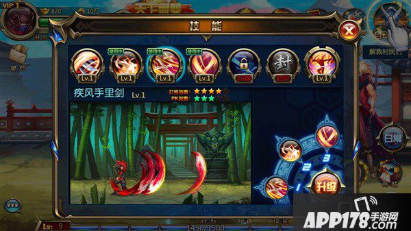 疾风手里剑:向前投掷三段手里剑,可远距离攻击前方敌人;打怪指数4颗星,PK指数3颗星;冷却时间7秒,攻击次数4次,造成精神消耗22MP。