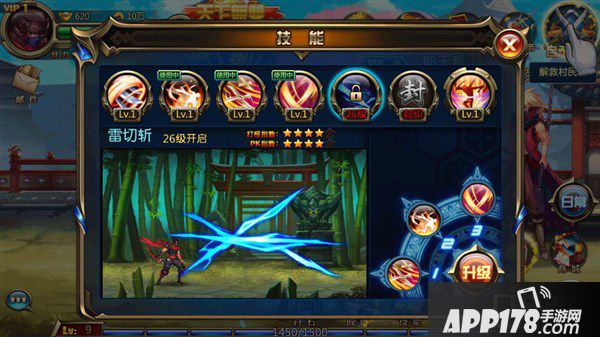 雷切斩:召唤四周雷电之力并引起共振,撕裂前方空间击毙敌人。打怪指数4颗星,PK指数4颗星;冷却时间8秒,攻击次数6次,造成精神消耗25MP。
