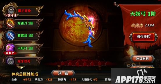 无限动态连击手游《霸道天下》2月26日删档内测来袭,神兵武器是我们在PK中秘密武器之一,随着角色等级提升不断,解锁这些神兵武器。在神兵熔炉到3重1阶1级时,就会解锁激活新的神兵天妖弓。