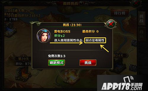 在进行巅峰挑战时,记得先看看关卡提示,特别是遇到BOSS类别的挑战时,注意看属性攻击及弱点倾向。其次,可有针对性地了解自己的属性抗性是否过硬,并知悉弱点,这样的话就可以在进入战斗时快速切换对应的神兵抢先下手。