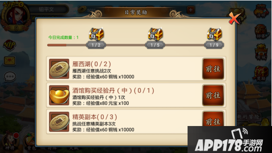 雁西湖(活动关卡)任意挑战2次。奖励60经验,100元宝。