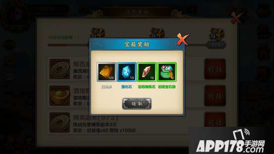 总计一天能获得740点经验,50000铜钱和500元宝!除此之外,每完成3个任务即可开启一个每日宝箱,宝箱中亦包涵您游戏中所需的大量材料。