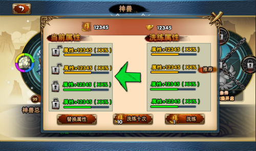 除了固定的属性加成形式外,玩家还可通过自由选择神兽洗练玩法选择专精属性。从而让每一个玩家角色出现与众不同的区别差异。