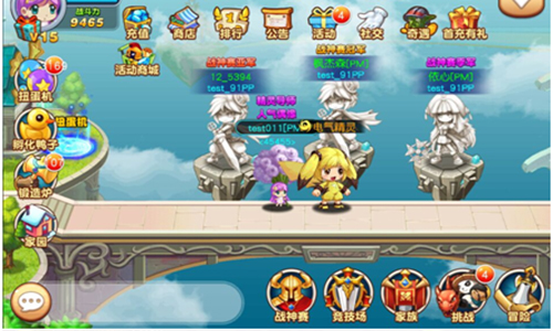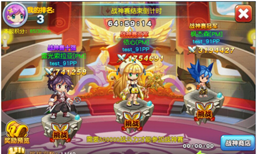 战力需要达到500000才有资格参与战神赛,主城中会显示出战神赛前三名玩家的雕像,突显出玩家的强力