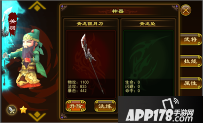 神器系统(特色):获得神器后,武将在外观上也有很大变化,伴随升级还会在神器特效上加以强化,在武将属性界面和各种战斗界面中玩家都可以看到这一区别。神器碎片须通过武将传副本获得。