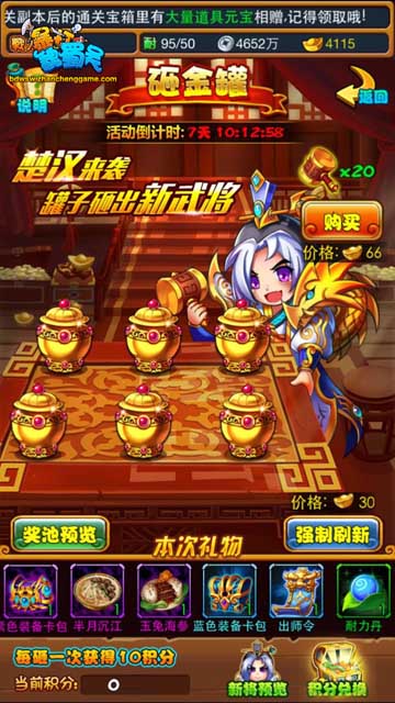 《暴打魏蜀吴》做的很人性化的地方就在于,开启这个活动时就会送你20个小锤,以后每天都会送你5个小锤! 完全免费啊,你每次还能看到自己砸的罐子都有什么,最后能不能砸到红将,完全凭手气了,而且不需要花费一分钱哦!!(为了我的红将,继续砸!)