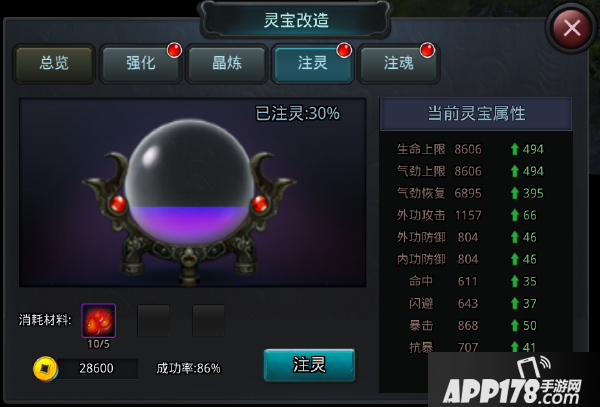 消耗注灵材料为灵宝注入灵气,灌注的灵气越多,灵宝的属性也就越强。