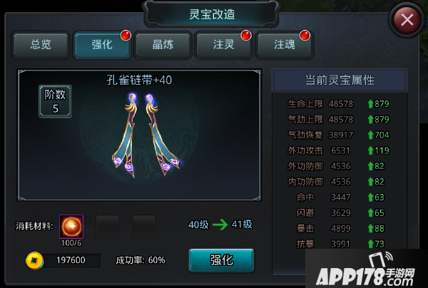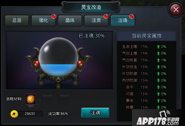 消耗相应材料可以对灵宝进行注魂,与注灵类似,注魂程度越高,灵宝加成的属性也越高。不同的是注魂是按百分比提升灵宝的属性。