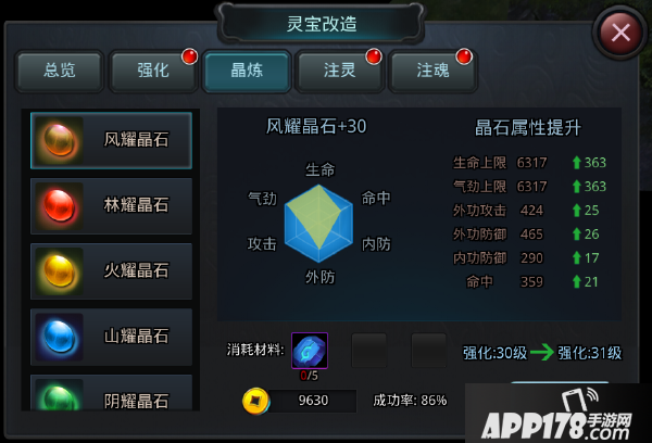 消耗晶石可以对灵宝进行晶炼操作,灵宝有6种可供晶炼的晶石,每种晶石有不同的属性加成倾向。