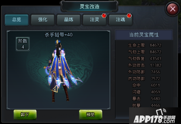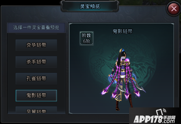 在总览界面中点击预览,可以查看各阶层的灵宝外观。