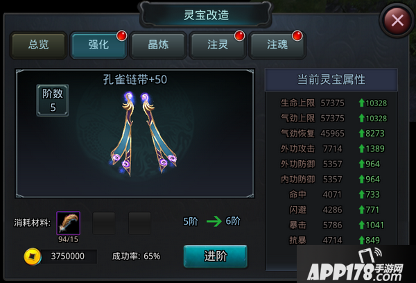 灵宝的强化等级每提升10级就可以进阶一次。每次进阶灵宝的属性都会大幅提升,灵宝的外观也会变得更加华丽。