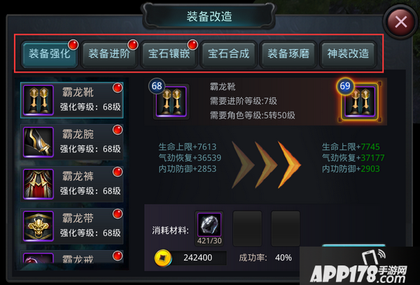(1).选择游戏界面上方的“强化”按钮可打开装备改造界面,选择上方的页面选项可对装备进行相关的改造操作。