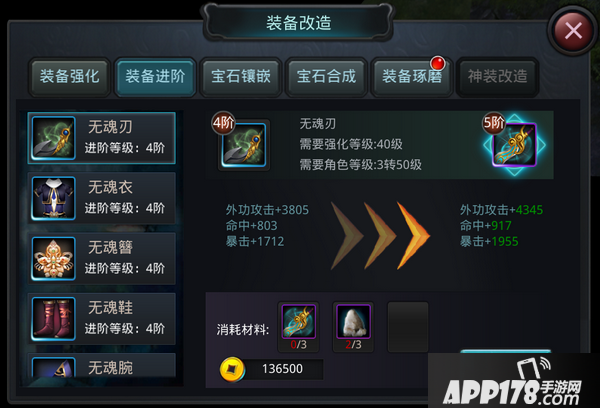 装备的强化等级每提升10级就可以进阶一次。每次进阶装备的属性都会大幅提升,装备的外观也会变得更加华丽。