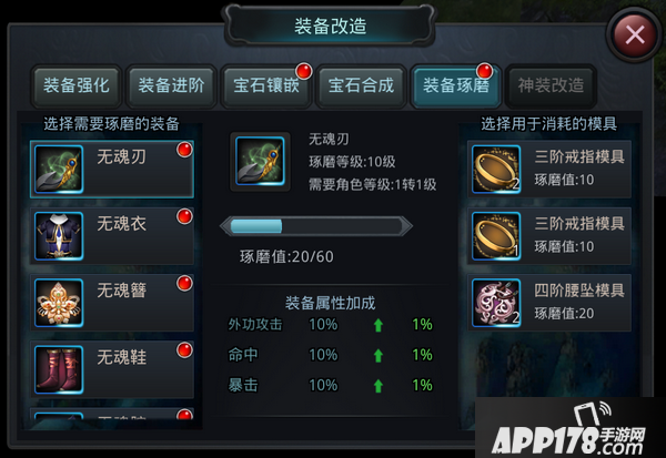 消耗无用的装备模具可以对装备进行琢磨,提升装备的琢磨值,装备当前的琢磨值满了以后就会提升琢磨等级。装备琢磨能够按百分比提升装备的属性。